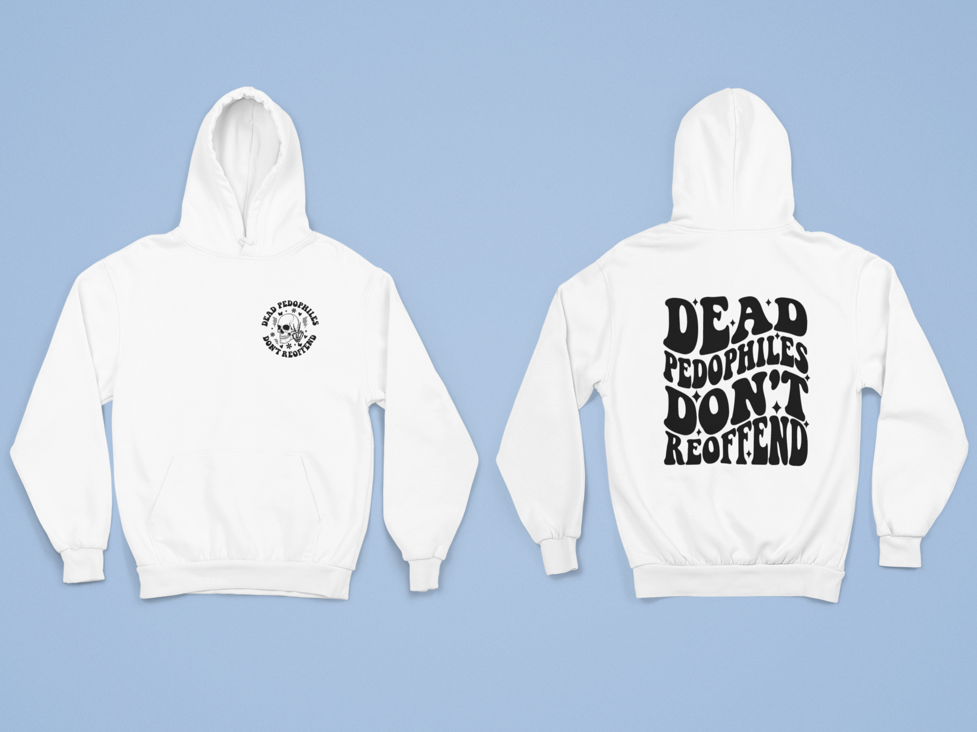 Make a statement with this bold graphic hoodie featuring the phrase “Dead Pedophiles Don’t Reoffend” in a striking typographic design. Created for those who support strong advocacy for child protection and awareness, this pullover combines meaningful expression with everyday comfort.